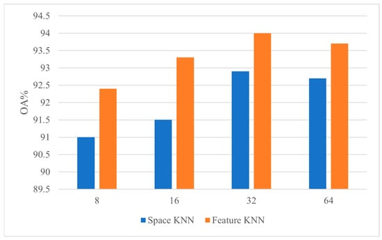 To further investigate the influence of different numbers of neighboring points on the network’s feature learning capability, this section conducts experiments using varying numbers of neighboring points, including 8, 16, 32, and 64. Additionally, we compare the OA of Euclidean k-nearest neighbors (KNN) and feature KNN, as shown in Figure 6. From Figure 6, it can be observed that the maximum difference in overall accuracy (OA) for feature KNN is 1.6%, while for spatial KNN it is 1.9%. Moreover, in terms of the segmentation accuracy with 32 neighboring points, feature KNN outperforms spatial KNN by 1.1%. This clearly demonstrates that the neighborhood points extracted by feature KNN are closer in category to their sampling center points, thereby enhancing the network model’s ability to distinguish between points belonging to different classes.