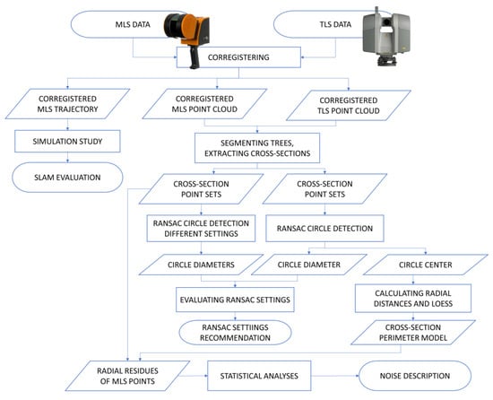 The objects of the analysis were the point representations of tree stem cross-sections. Therefore, individual tree point clouds were manually extracted and filtered in CloudCompare 2.12. Trees with incomplete stem reconstruction in either of the two datasets were manually removed from the study material, as well as trees with forked or damaged stems. All subsequent processing and analyses were performed in MATLAB R2021b (The MathWorks Inc., Natick, MA, USA). From the cleared MLS and TLS point clouds, points representing stem cross-sections in 11 different height levels were extracted. The above ground heights of the cross-sections were from 0.5 m to 2.5 m with 0.2 m spacing, and the height of the extracted cross-sections was 1 cm. As a result, the GeoSLAM noise was analyzed in 960 stem cross-sections of Norway spruce and 869 stem cross-sections of European beech.