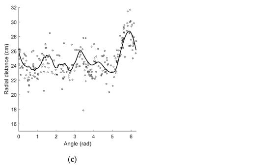 - Positions of all cross-section perimeter points in TLS data were transformed to polar coordinates, i.e., the angle θ and the radial distance r. The angle from the cross-section center was calculated as the four-quadrant inverse tangent. The radial distance was calculated as the Euclidean distance between the point from the cross-section center point. The LOESS method was used to smooth the radial distances according to their respective azimuth (Figure 3); to ensure the required continuity of the smoothed curve, three repetitions of the point sequence were concatenated, and the smoothed values of the middle repetition were used. The resulting curve was considered a model of the cross-section perimeter.