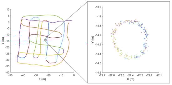 The trajectory was manually divided into segments corresponding to individual scan lines, separated by rectangular vertices in the parallel-line pattern (Figure 4). Each point was associated with the corresponding trajectory segment based on the GPS time recorded in both the LAS file and the trajectory log.