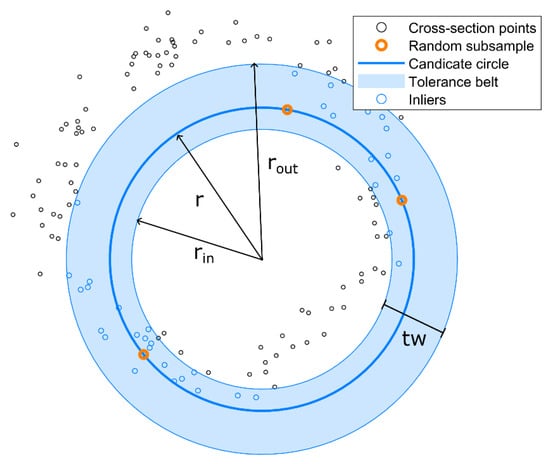 The RANSAC parameters: tw—tolerance belt width; r—radius of the candidate circle fitted to the random subsample; rin and rout—inner and outer radius of the tolerance belt.