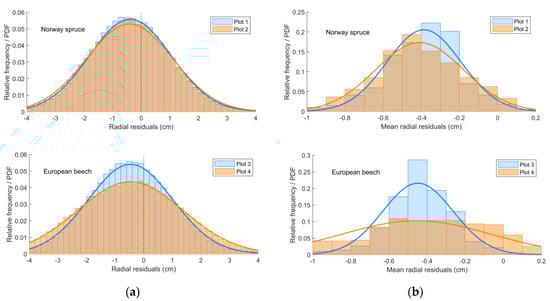 The distribution of radial residuals in both species approaches a normal distribution, as illustrated in (Figure 6a), which displays the histogram of radial residuals along with the probability density functions (PDFs) of the fitted normal distributions. The parameters of the distributions vary between species: in the spruce dataset, the mean residual was −0.38 cm and −0.40 cm, on plots 1 and 2, respectively, whereas the beech dataset showed a mean residual of −0.46 cm and −0.43 cm on plots 3 and 4. Both means are significantly different from zero, as indicated by the confidence intervals in Table 2. The hypothesis of zero difference between mean residuals in the two species was rejected by a two-sample t-test (p-value < 10−10). This result implies that the noise in ZEB reconstruction of tree stems is not symmetrically distributed on both sides of the stem surface.