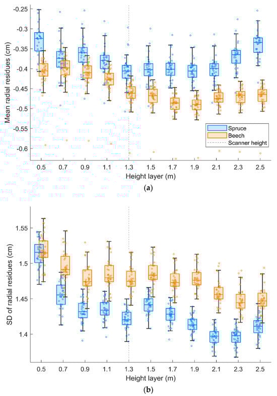 The Figure 6b shows the distribution of mean radial residuals in individual cross-sections for both species. The mean estimates of the mean radial residuals in cross-sections do not deviate significantly from the overall mean residuals, indicating that the distribution of radial residuals remains consistent throughout the trees and cross-sections of each species. The majority of cross-sections exhibited negative mean residuals, i.e., the return positions were shifted towards the center of the stem. Only 2% and 4% on plots 1 and 2, respectively, of cross-sections had the average residual positive for spruce. For beech, less than 0.5% of cross-sections had the average residuals positive on plot 3; plot 4 showed 9% of cross-sections with positive mean residuals, which is the effect of inconsistently large variability on plot 4, as visible in Figure 6 and shown in Table 2. The observed large variability in plot 4 might reflect an eventual error in co-registration of TLS and MLS clouds, or SLAM distortion. However, the mean of the distribution remains consistent with other plots. For spruce, the negative deviation is, on average, smaller than for beech.