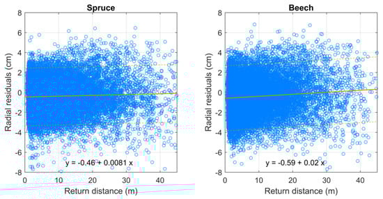 Highly significant linear trends (p-values < 10−10) were identified in the dependence of radial residuals on the distance between the point and the scanner position from which the point was acquired (the return distance). In both species, the residual values tended to shift from negative averages for small distances to positive averages for larger distances (Figure 8). Specifically, in beech, the mean residual value shifted from negative to positive beyond a return distance of 29 m. For spruce, this transition occurred at a threshold distance of 56 m, which was technically the maximum distance recorded in the point cloud; only a few points were recorded from longer distance.