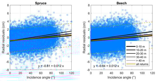 In both species, a consistent trend of increasing residuals with higher incidence angles was observed. The greater the angular deviation from the tree center to the scanner position line, the higher the average residual became, shifting from negative (−0.75 cm for spruce and −0.84 cm for beech). The trend exhibited an identical slope of 0.011 for both species. To explore if the observed trend can be attributed to the effect of return distance, returns were classified into five distance classes (see the legend in Figure 9), and separate linear models were applied for each class. The trend remained consistent across all distance classes. The charts in Figure 9 show several points with incidence angle over 90°. Such points are theoretically impossible to occur on cylindrical stems; however, they may appear in scans of irregular cross-sections.