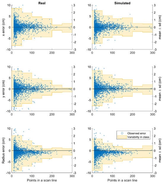 The errors and their corresponding numerical characteristics from real cross-section segments are displayed in the left part of Figure 10. The right part displays identical outcomes derived from the point cloud segments simulated by randomly assigning points to each segment, maintaining the point count and angular distribution. Except for the last point count class (251–300 points), which only contained three observations, there were no differences in errors produced with the real and simulated point segments. The cross-section parameters derived from individual scans do not exhibit higher errors than randomly generated point sets. This result indicates that individual scans are combined into a homogeneous cloud, rather than forming distinct point structures within the noise range.