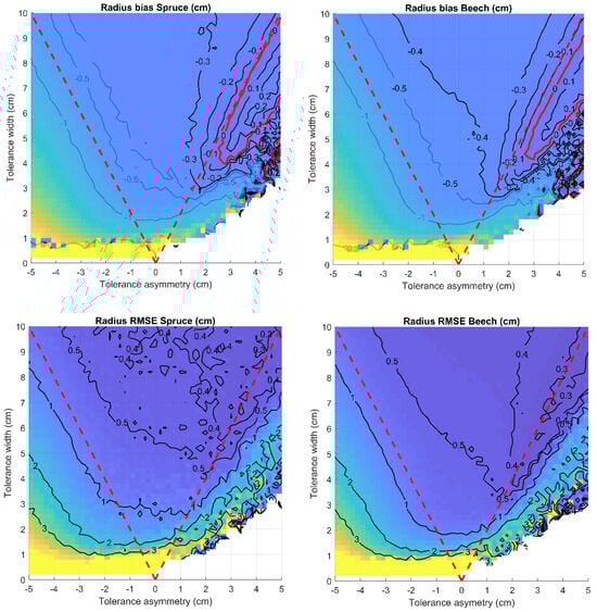 There is consistency between both indicators concerning the parameter selection. The smallest radius RMSE errors, dropping as low as 0.3 cm (equivalent to 0.6 cm in diameter), were achieved with the parameter combination ensuring zero bias. The observed relationship between errors and tolerance width, as well as asymmetry, indicates that the most accurate diameter estimates were obtained with a minimum tolerance belt width of 4 cm and an asymmetry approaching half of the tolerance belt width. The choice of tolerance width between 4 and 10 cm did not affect the accuracy of diameter estimation, provided that the asymmetry was set to the half the tolerance width.