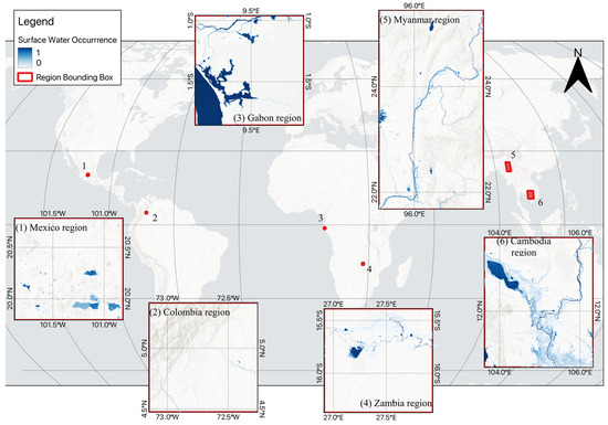 This study focused on six regions spanning diverse ecological and climatological conditions across the globe (Figure 2). The regions include the upper tributaries of the Magdalena River basin in Colombia, prone to frequent flooding; the outflow region of the Ogooué River basin in Gabon, characterized by extensive wetlands and floodplains; central Mexico, with reservoirs susceptible to both floods and droughts; the Zambezi River basin in Zambia, exhibiting significant seasonal variations in water levels; the Upper Irrawaddy River system in Northern Myanmar, which experiences severe flooding during the summer monsoon months; and the floodplains of the Lower Mekong basin in the Cambodian Tonlé Sap sub-watershed, a dynamic ecosystem with significant seasonal changes in water extent. These regions were selected to represent a variety of landscapes, climates, and surface water dynamics as well as to include major challenges for surface water mapping, including sites influenced by topography, cloud cover, vegetation, and additional land cover features, and regions with permanent low backscatter (e.g., flat and impervious areas, sandy surfaces). The sites also included a diversity of waterbodies, ranging from large waterbodies (wind and wave effects) to smaller waterbodies of both a permanent and seasonal nature, as well as waterbodies with varying water quality and shallow waters influenced by bottom reflectance. These diverse regions allowed us to assess the generalizability and effectiveness of our data fusion method across different environments. Furthermore, validation data were readily available for validation over these regions during the study period.