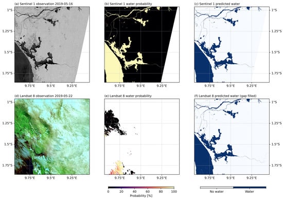 We applied the logistic regression models and resulting water classification to the imagery for the regions with validation data. We gap filled the optical imagery using SAR data following our method. Figure 3 highlights the results of the logistic regression model and water mapping for both the SAR and optical imagery for observations in May 2019 for an area in the Cambodia region. Figure 4 displays the same information, observations, logistic regression, and water mapping results as Figure 3 but for a case from the Gabon region. The figures show that the resulting model probabilities and water mapping were able to capture the spatial extent of surface water well when compared to the observation. We gap filled the optical water maps’ (Figure 3f and Figure 4f) areas of the optical imagery that were cloud occluded or had poor-quality pixels identified in the QA band. The figures show that gap filling produced a realistic water surface result in the absence of an in situ observation. Figure 4 is a more extreme case, where most of the area in the optical imagery was obscured by clouds, though there was a small area that produced enough data so that gap filling using SAR data could be performed. The location shown in Figure 3 was a less extreme case, where there was less cloud occlusion, and the gaps that needed to be filled using the SAR data were a smaller percentage of the water area.