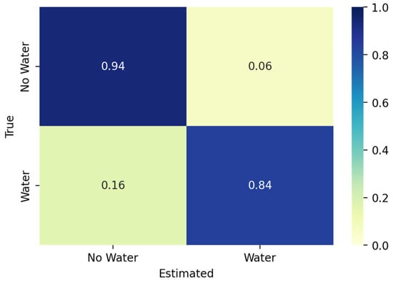 We validated the water predictions using the dataset from Tottrup et al. [55] and Markert et al. [56]. We found that the overall accuracy of our method based on the validation dataset was 0.9025 with a FAR of 0.0631 and a POD of 0.8394. This assumes that the validation dataset was “true”. The CSI metric was 0.8073, a good score [74]. Figure 4 shows the confusion matrix using all of the validation samples (n = 8974). Figure 5 shows that the overall false positive rate was around 6% compared to the false negative rate of 16%. These results indicate that the method generally performs well at identifying water areas; however, it slightly underpredicted water areas, that is, higher false negatives.