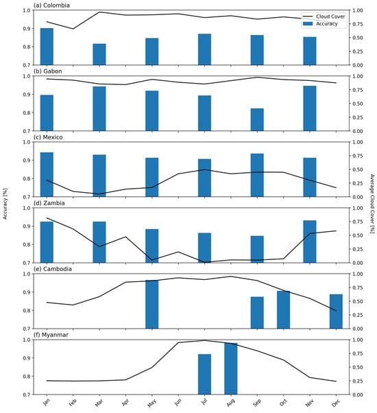Accuracy of water mapping results for all sites for months with available data in 2019 and monthly average cloud cover (black line). Months with no reported accuracy are time periods with no available validation data.