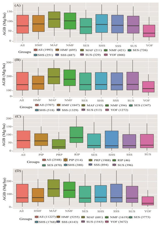- Age and aspect stratification significantly improved the estimation accuracy of AGB, and the accuracy of the NEF age stratification model was significantly improved. The improvements in R2 values were as follows: P. kesiya var. langbianensis (0.02), oak (0.06), H. brasiliensis (0.03), and other broadleaf forests (0.10). In aspect stratification, the SHS model had the best fitting effect for P. kesiya var. langbianensis (0.8675) and H. brasiliensis (0.8388), while the SUS model achieved the best fitting effect on the AGB model of oak (0.8364) and other broad-leaved trees (0.8240).