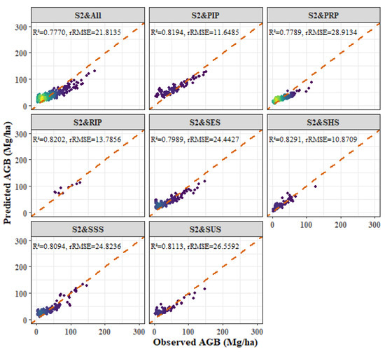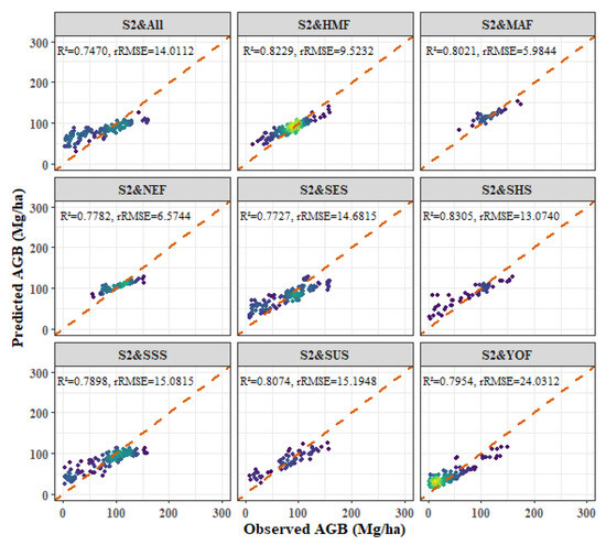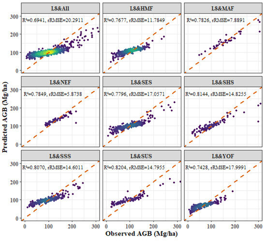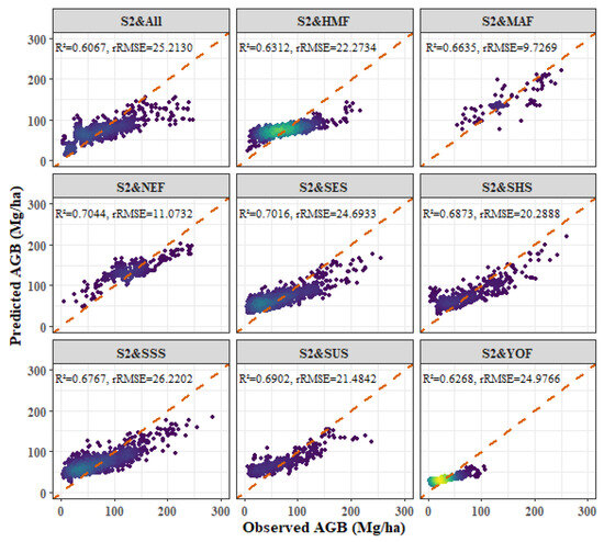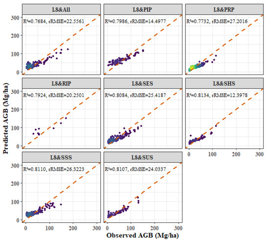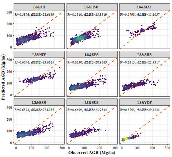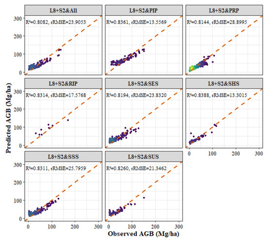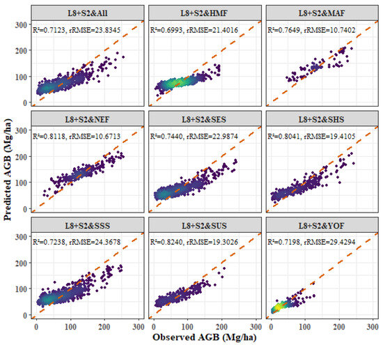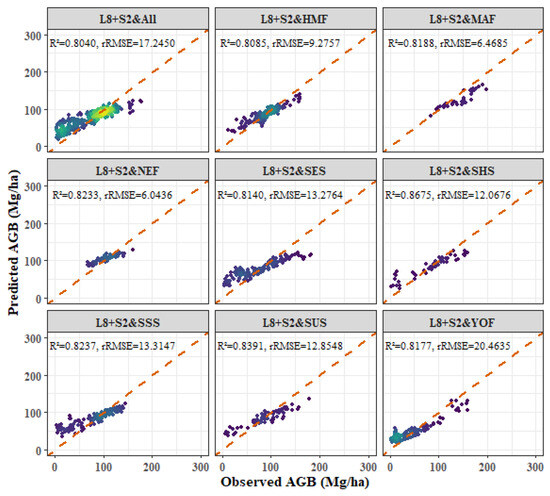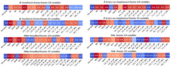 - Among the four forest types, the fitting effect of L8 and S2 combined images is better than that of S2 or L8 alone. The R2 values for the combined L8 + S2 analysis for the four forest types were as follows: P. kesiya var. langbianensis (0.8040), oak (0.7741), H. brasiliensis (0.8082), and other broadleaf forests (0.7123).