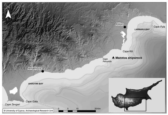 Location of Mazotos shipwreck site. (A. Agapiou, © University of Cyprus, Archaeological Research Unit (ARU). Data compiled from the Geological Survey of Cyprus). Image from [].