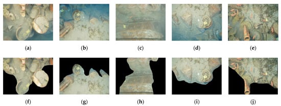 Samples of “ground truth” as manually extracted from selected images of Dataset A. Original images (a–e) with the masked “ground-truth” counterparts (f–j). Credits: MARELab, © University of Cyprus. Photographer: Massimiliano Secci.