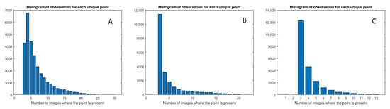 Histograms of the number of images to which the ground-truth points were matched. Datasets (A–C).