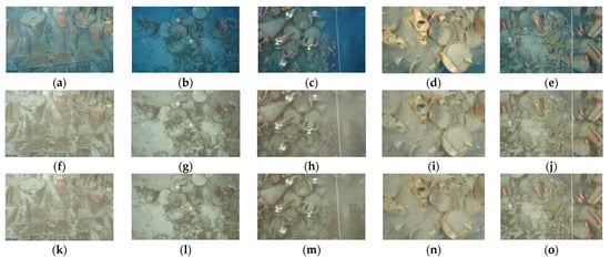 Training results on 5 images with Adam and RMSprop optimisers ((a–e) Original images, (f–j) Adam optimiser-based prediction results, and (k–o) RMSprop optimiser-based prediction results). Dataset A, Camera: Sony SLT-A57. Images acquired at the Mazotos shipwreck site. Credits: MARELab, © University of Cyprus. Photographer: Massimiliano Secci.