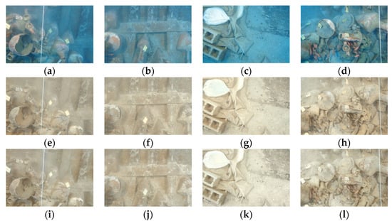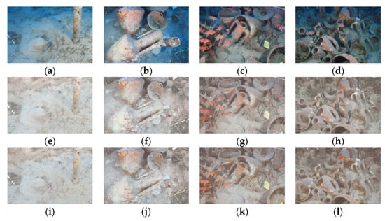 Training results on 4 images with Adam and RMSprop optimisers ((a–d) Original images, (e–h) Adam optimiser-based prediction results, and (i–l) RMSprop optimiser-based prediction results). Dataset B, Camera: Sony SLT-A57. Images acquired at the Mazotos shipwreck site. Credits: MARELab, © University of Cyprus. Photographer: Massimiliano Secci.