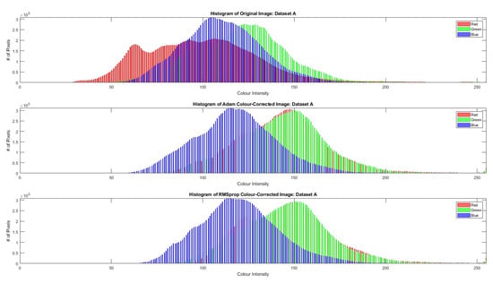 Image histograms of a sample image from Dataset A. Top: original image; middle: Adam optimizer; bottom: RMSprop optimizer.