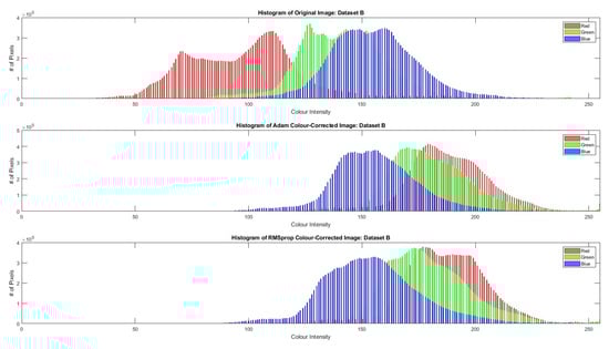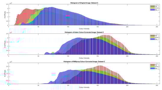 As shown above, both optimizers managed to significantly restore the missing information of the red and green colours across the images. We also observed a slight increase in the blue colour inside the scene (Dataset C), which is not noticeable in the visual results shown above in Figure 8. From the image histograms, it is clear that a significant amount of colour information is restored in the colour-corrected images for both optimizers.