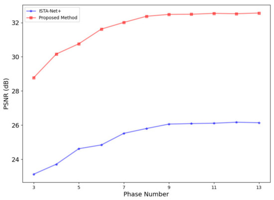 Additionally, we evaluated the imaging times of four methods with an ablation study. Table 5 compares the imaging times of these methods under the default setting of nine stages (K = 9). Among them, the ISTA-Net+ method is the fastest, while our proposed method is the slowest. The imaging times for ISTA-Net+ with HSM and ISTA-Net+ with CLM are longer than that for ISTA-Net+ alone. This increase in time can be attributed to the fact that HSM and CLM enhance reconstruction quality by, respectively, increasing the amount of information transmission between stages of the model, and establishing long-range connections across stages through the introduction of the ConvLSTM module. Both approaches add to the computational load, thereby slowing down the imaging speed.