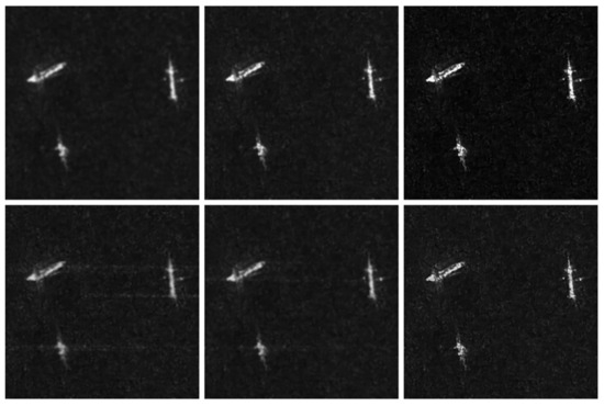 To assess the applicability of the MADUN-based sparse SAR imaging algorithm in marine sparse scenes, its efficacy in real-data imaging must be established. In the experiment, sparse marine scenes captured by Sentinel-1 and GF-3 satellites were selected for training. Each dataset comprised 1100 echo data slices of dimensions 256 × 256, with 1000 slices allocated for training and 100 slices designated for testing. Ground truth images were generated using the conventional Range-Doppler Algorithm (RDA) for imaging, which was then subjected to feature enhancement, sidelobe suppression, and noise reduction techniques to diminish noise levels [21]. Three distinct scenarios—ships, islands, and waves—were chosen to evaluate the algorithm’s reconstruction capabilities in these contexts and to benchmark them against ISTA and ISTA-Net+. The Entropy (ENT) metric was employed for quantitative assessment. Figure 12 and Table 6 showcase the SAR reconstruction outcomes and evaluation metrics for the three scenes across various sampling rates.