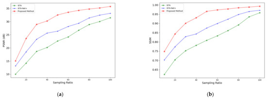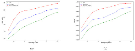 Figure 7 illustrates the comparative reconstruction efficacy of the three methodologies at varied sampling ratios (ranging from 10% to 90%) as well as at full sampling, depicted through curves representing various averaged metrics. These results elucidate that the reconstruction quality of all methods escalates as the sampling ratio increases. Notably, our proposed method consistently surpasses the performance of both ISTA and ISTA-Net+ algorithms across the entire range of sampling ratios, indicating its superior reconstruction capability.