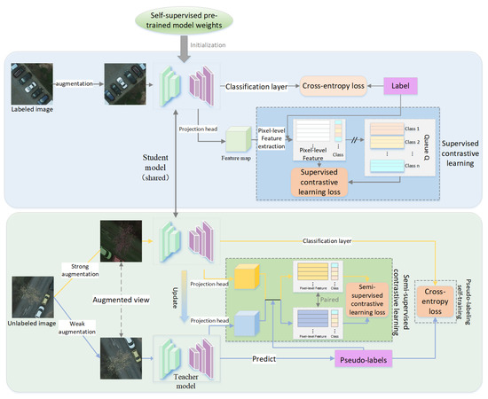 - Loss function for semi-supervised contrastive learning: For each anchor sample , the positive sample is the pixel feature paired with it, and its negative samples are all the pixel features in the current training batch data that are not in the same class as . The class information of these samples is obtained from the pseudo-label . The final semi-supervised contrastive learning loss is defined as follows:where denotes the total number of paired pixel features selected in the whole batch, denotes the pixel features of other categories among the pixel features whose pseudo-labeling categories do not belong to the same sample class as , and is a temperature hyperparameter.