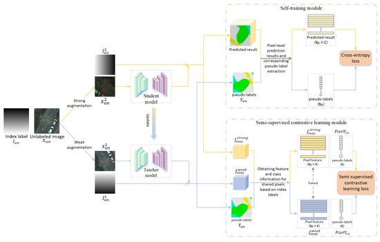 The core idea of this module is to use unlabeled data and its pseudo-labels as a medium to transfer knowledge from one model (called the teacher model) to another model (the student model). During self-training, the predictions of the teacher model are relatively reliable and used as pseudo-labels since it takes input data with no significant perturbations applied. At the same time, the student model takes significantly perturbed data as input and is asked to obtain predictions consistent with the output of the teacher model. In this way, the useful features in the teacher model that facilitate the semantic segmentation task are gradually distilled into the student model. Then, when the student network outperforms the teacher network it is used again as a new teacher network. Through multiple iterations, the student model is continuously optimized and achieves better performance in the downstream task of semantic segmentation.