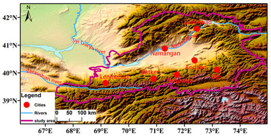 The Ferghana Basin is a closed intermountain basin in Central Asia and covers parts of the three countries of Uzbekistan, Kyrgyzstan, and Tajikistan. Located on the western side of the Pamir Plateau, the Ferghana Basin is surrounded by the Tien Shan and the Gissar-Alai mountain ranges, with river valleys and mountain passes leading out of the basin. The basin is 300 km long from east to west and 170 km wide from north to south, with an altitude of 330 to 1000 m above sea level. The climatic characteristics of the Ferghana Basin are mainly continental and arid, and generally show the characteristics of hot and dry. Since the region is located inland in Central Asia, far from the ocean, there is relatively little precipitation and it is characterized by dryness overall. The seasonal climate shows cold and dry winters and hot and arid summers. Because of the geographical location, the temperature diversity between day and night in the Ferghana Basin is large, with hot days and sudden drops at night, which influences the development of vegetation to a certain extent. Figure 1 overviews the research region. The Ferghana Basin, one of the most densely populated areas in Central Asia, is known as the “Fruit and Vegetable Basin of Central Asia”, where irrigated agriculture and animal husbandry have been developed since ancient times, and the main crops include cotton, wheat, grapes, alfalfa, and vegetables, etc. Dozens of rivers, such as the Syrdarya, Karadarya, Sokh, and Isfara, have formed the most complex water network in Central Asia in the Ferghana Basin. Figure 2 illustrates the variety of land cover types in the Ferghana Basin, including grasslands, meadows, deserts, deserts, agricultural lands, lakes, rivers, mountains, and forests, etc., which are interspersed with each other and together form the rich and diverse natural landscape of the basin.