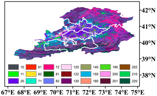 Thirty-meter land cover types in the Ferghana Basin, 2010, 10—Rainfed cropland, 11—Herbaceous cover, 20—Irrigated cropland, 61—Open deciduous broadleaved forest, 62—Closed deciduous broadleaved forest, 71—Open evergreen needle-leaved forest, 72—Closed evergreen needle-leaved forest, 81—Open deciduous needle-leaved forest, 82—Closed deciduous needle-leaved forest, 120—Shrubland, 122—Deciduous shrubland, 130—Grassland, 140—Lichens and mosses, 150—Sparse vegetation, 180—Wetlands, 190—Impervious surfaces, 200—Bare areas, 201—Consolidated bare areas, 202—Unconsolidated bare areas, 210—Water body, 220—Permanent ice and snow.