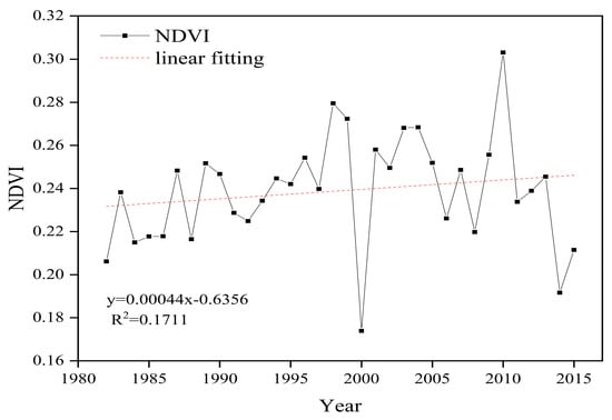 Interannual change of NDVI during developing season in the Ferghana Basin from 1982 to 2015.