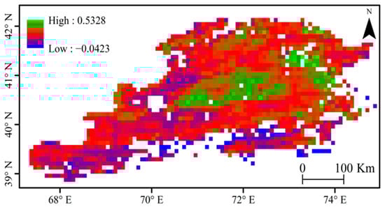 The calculation of the interannual tendency of NDVI in the developing season was made with univariate linear regression, and the definition of the linear regression equation slope as the interannual tendency rate of NDVI was made. The slope gradient is calculated with reference to Wang et al. [45]. slope < 0 and slope > 0 suggest growing and declining NDVI sequences over time. In case of a bigger absolute value of slope, the variation in NDVI will be faster during the developing season.