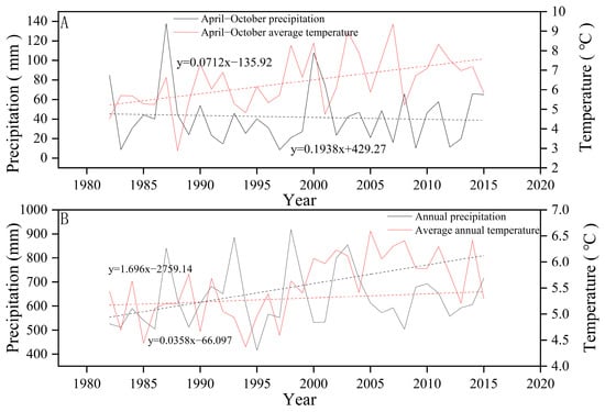 Interannual and growing season variations in climate factors in the study area, 1982−2015. (A): April−October factors; (B): Annual factors.