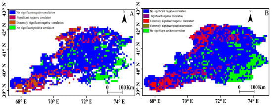 Spatial distribution of biased correlations between NDVI and climate factors for growing season vegetation from 1982−2015. (A): Growing season NDVI is biased with precipitation; (B): Growing season NDVI is biased with temperature.