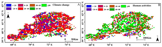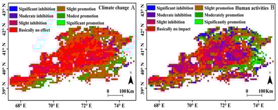 Spatial distribution of the impacts of climatic change and human activities on vegetation restoration in Ferghana Basin during 1982–2015. (A): Climate change; (B): Human activities.