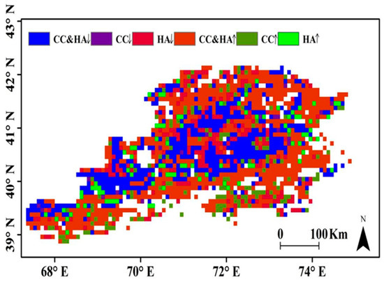 Spatial distribution of driving factors of vegetation cover change in the Ferghana Basin from 1982 to 2015 (CC and HA refer to climate change and human activities, respectively), ↑ represents an increase, ↓ represents a decrease.