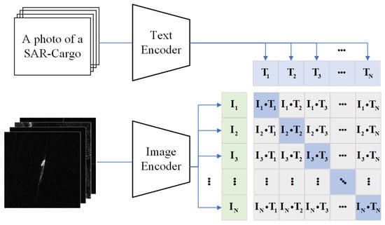 Secondly, in the obtained and , the text–image pairs have a one-to-one correspondence: i.e., corresponds to , corresponds to , etc. These N corresponding pairs are denoted as positive samples, whereas the non-corresponding text–image pairs (i.e., does not correspond to , does not correspond to ) are denoted as negative samples. Thus, in total, there exist N positive samples and negative samples, which are used as positive and negative labels to train the Text Encoder and Image Encoder.