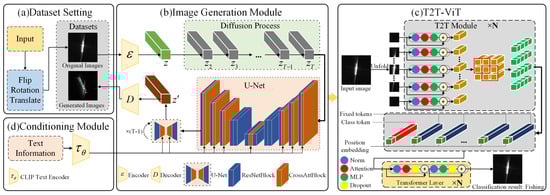 The overall framework of the proposed method is illustrated in Figure 3. As a backbone network, T2T-ViT achieves good results without the need for a massive pre-training dataset. In cases of insufficient data samples, we employ an image generation module. In the Conditioning Module, text information is input and encoded, combined with the U-Net structure in the image generation module. This integration generates SAR ship images corresponding to the textual descriptions, serving as supplements. Subsequently, the data samples are input into the T2T-ViT network for training. Incorporating an SE attention mechanism into the backbone network enhances its focus on crucial features, optimizing overall performance. After processing through the T2T module, the input images are fed into the backbone network, ultimately yielding the classification results of the target.