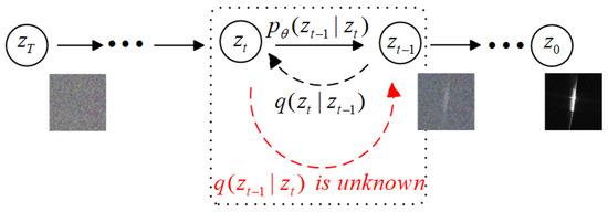 The denoising process occurs in a manner opposite to the previous process operation, during which we gradually remove noise from the data. If the function distribution can be obtained at each step of the denoising process, then the initial input image information can be extracted despite the presence of pure random noise by removing the noise repeatedly. Therefore, the denoising process can be considered a data generation process. In this process, the Gaussian distribution of each state is parameterized using neural networks and is correlated with the others in a Markov chain. This operation can be mathematically expressed as follows: