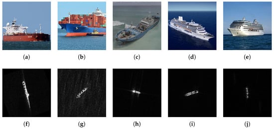 SAR ship samples in FUSAR-Ship dataset. Among these, (a–e) represent optical images of Bulk Carrier, Cargo, Fishing, Tanker, and Other, and (f–j) represent SAR images of Bulk Carrier, Cargo, Fishing, Tanker, and Other.