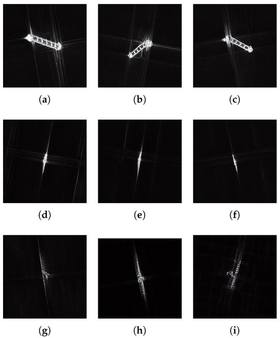 Three major categories with relatively abundant samples were initially selected from the OpenSARShip2.0 dataset, namely, Cargo, Fishing, and Tug, for our experiments. Figure 7 presents sample images of these three classes of SAR ships. However, it turned out that these original datasets have some drawbacks. Firstly, there is a lack of uniformity in the image sizes, which can be cumbersome for application to deep learning networks. Secondly, there is a significant disparity in the number of data samples among different ship categories, with Cargo having nearly 20,000 samples, far exceeding the sample counts of other ship categories. Therefore, we preprocessed the selected samples of the three ship categories by standardizing the image size to pixels. Addressing the issue of class imbalance in the SAR ship dataset, data augmentation was performed on the training dataset. Initially, we applied horizontal and vertical flips to enhance the diversity of data samples. Subsequently, we rotated the data samples by 90°, 180°, and 270° to simulate various angles of vessels in real scenarios. Lastly, we randomly translated ship sample images, with pixel translation values ranging from −5 to 5, to introduce spatial variations in the data samples. Following a series of data augmentation processes, the data samples were expanded to four times their original size, as shown in Table 1, where the number of training samples for the three ship categories based on the OpenSARShip2.0 dataset can also be found.