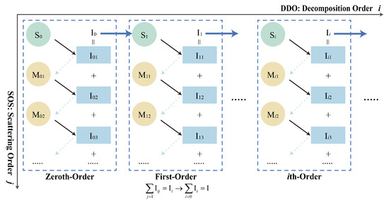 The flow chart of the diffraction decomposition order (DDO) algorithm realized by the successive order of scattering (SOS) method. The signals S, M, and I denote single scattering, multiple scattering, and Stokes vector, respectively.