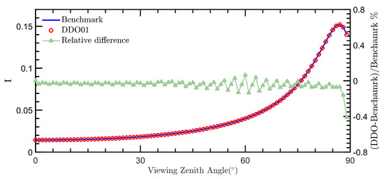 The benchmark results are given by Kokhanovsky et al. [5]. Figure 3 shows the reflected radiance and corresponding relative difference in the case of a predefined aerosol layer. The results show excellent consistency with the benchmark, with errors within 0.5%. Large errors are shown when the viewing zenith angles are close to 90° because the effective optical depth is close to infinity. The zenith angles and azimuthal angles for the solar, upward and downward directions are illustrated in Figure 4.