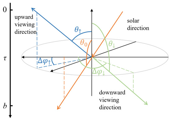 where and denote the viewing and solar solid angles, respectively; ; ; , , and are the Stokes vector, scattering phase matrix, and single scattering albedo, respectively; is the solar irradiance. The argument of the physical quantities is suppressed in the equations. and are used to denote the upward and downward solid angles.
