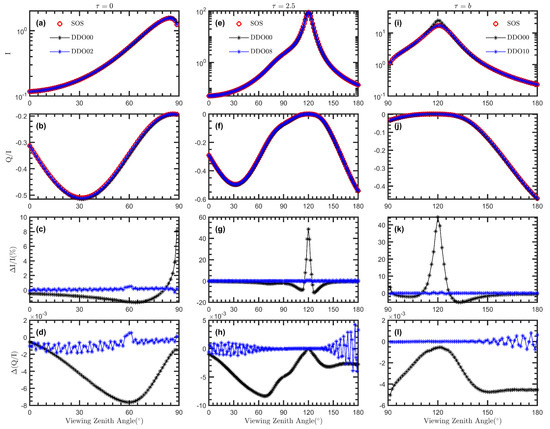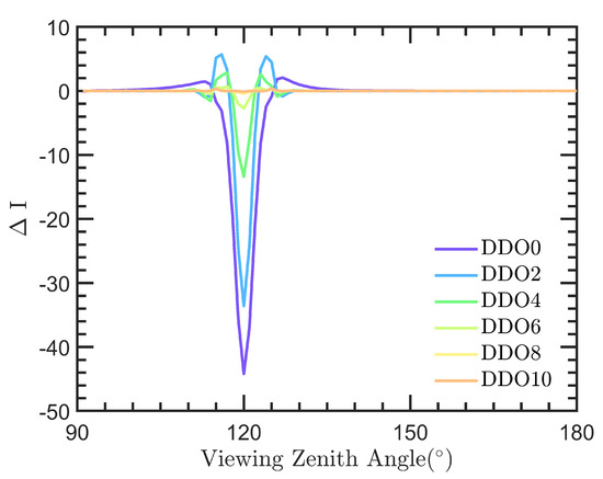 Stokes vectors are highly influenced by the RVP when the viewing azimuthal angle (VAA) aligns with the solar azimuthal angle. The upward and downward Stokes vectors and their differences with at the layer top, middle, and bottom are shown in Figure 6, respectively. The legend DDO00 denotes the results from the zeroth-order equation, while the other DDO legends denote results from accumulated high-order contributions. The viewing zenith angles (VZA) are all from to , but only non-zero parts are plotted in the figures as the downward ones in Figure 6a–d and the upward ones in Figure 6i–l. Each scattering of the RVP is limited to small angles. Consequently, the influence on upward directions is much less than on downward directions, and the influence on small upward VZAs is much less than on large upward VZAs. The VZAs close to the solar zenith angle are sensitive to the RVP, as shown in Figure 6e–l. The differences between the original and zeroth-order equations can be gradually reduced by the successive consideration of the diffraction orders. The order number reflects the degree of influence from the RVP.