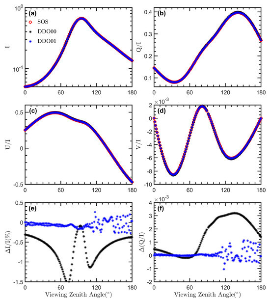 Stokes vector I (a) and the relative values of Q, U, V (b–d) and the relative differences (e,f) comparisons at calculated by the SOS and the DDO methods with different orders when the VAA is .
