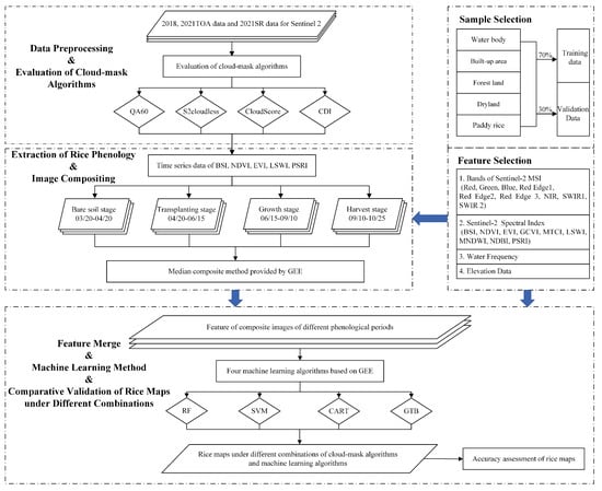 The workflow of the study included data preprocessing and cloud mask algorithm evaluation, sample selection and feature selection, extraction of rice phenology and image compositing, comparisons of machine-learning algorithms in rice mapping and validation of rice maps (validation of field data samples, comparison of 10 m rice maps, and comparison of statistical data).