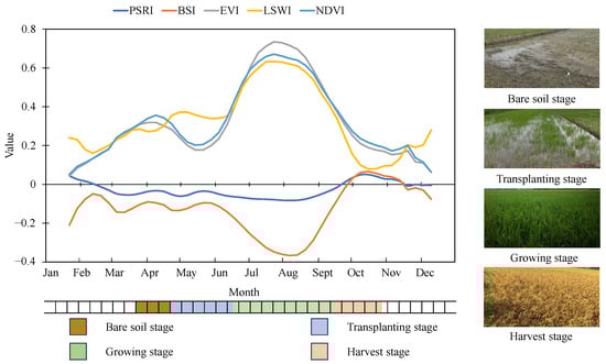 Paddy rice phenological stages derived from the fitted curves of five spectral indices based on the cloud-masked TOA dataset in 2021 (field photographs were taken at E, N).