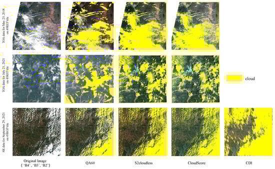 To further evaluate the detailed features after cloud removal, we selected three 10 × 10 km grids from the three tiles. As shown in Figure 5, a lot of pseudo-clear pixels are retained for the next procedure when masked by the QA60 algorithm. The S2cloudless algorithm shows overall excellent performance in identifying cloud pixels with detailed information. CloudScore algorithm exhibits a rather strong ability to remove cloud pixels, although it is slightly weak in haze removal (Figure 4 and Figure 5). For the CDI algorithm, the masks of cloud pixels appear in a stripe shape, and some clear pixels were removed while cloud pixels were retained.